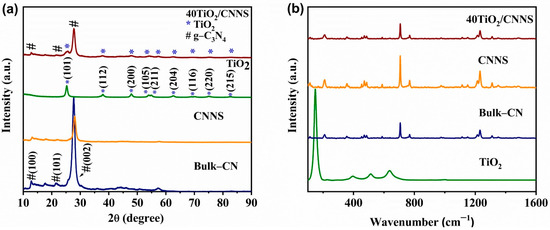 Powder X-ray diffraction (PXRD) patterns of the bulk-CN, CNNS, TiO2 and 40TiO2/CNNS nanocomposites are shown in Figure 1a. As all nanocomposites (20TiO2/CNNS -50TiO2/CNNS) exhibit identical diffraction patterns, only that of 40TiO2/CNNS is shown. Bulk-CN and CNNS display three characteristic peaks at around 13.0°, 21.6°, and 27.5°, which are assigned to the (100), (101), and (002) hexagonal crystal planes (JCPDS 87-1526), respectively [36]. The sharp peak at 27.5° is attributed to interlayer stacking of aromatic rings, with the lower intensity peak at 13.0° being due to the presence of tri-s-triazine units [37,38]. The (002) peak intensity decreases significantly on conversion of bulk-CN to CNNS, and exhibits a slight shift in 2θ, reflecting the exfoliation of bulk-CN to nanosheets with shorter stacking distances between g-C3N4 layers [39,40]. Titanium dioxide exhibits diffraction peaks corresponding to the (101), (112), (200), (105), (211), (204), (116), (220), and (215) planes, consistent with the material existing as tetragonal anatase (JCPDS 021-1272) [41,42]. As expected, the patterns of g-C3N4/TiO2 nanocomposites exhibit peaks arising from both pure g-C3N4 and TiO2, and the absence of any peak shifting in the TiO2 peaks relative to anatase (Figure S1) indicates that coupling with g-C3N4 does not influence the TiO2 lattice structure, which might be beneficial regarding the photocatalytic activity of the hybrid photocatalyst.