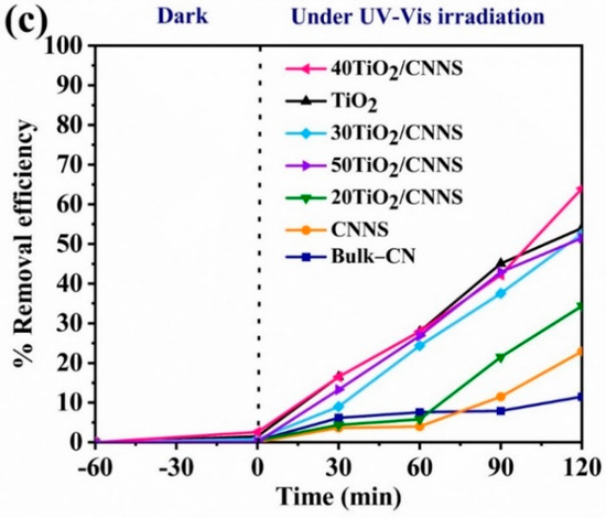 Results in Figure 5 show that Bulk-CN, CNNS, and 20TiO2/CNNS materials are only marginally effective for MCPs degradation, with removal efficiencies being less than 50% after 2 h. This is presumably due to electron-hole recombination, as implied by PL results (Figure 4b).