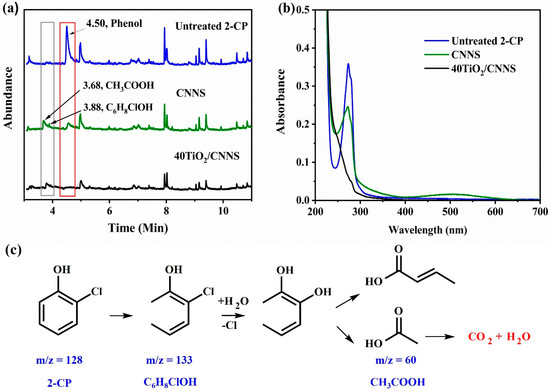 To analyze the degradation pathway of 2-chlorophenol, GC-MS was employed to visualize and identify potential breakdown products. As shown in Figure 6a, the GC trace of untreated 2-CP shows a peak corresponding to the phenol at a retention time of 4.50 min. The intensity of this peak decreases on treatment with CNNS and is completely absent after treatment with 40TiO2/CNNS, which is in agreement with UV–Vis spectra obtained for solutions treated with this photocatalyst (Figure 6b). Intermediate products were observed at retention times of 3.68 (m/z = 63) and 3.88 (m/z = 133) min after treatment with CNNS or 40TiO2/CNNS which, based on fragmentation data, could be acetic acid (CH3COOH) [70,71] and C6H8ClOH, respectively. A possible degradation pathway for 2-CP, under optimum conditions in the presence of 40TiO2/CNNS, is proposed in Figure 6c.