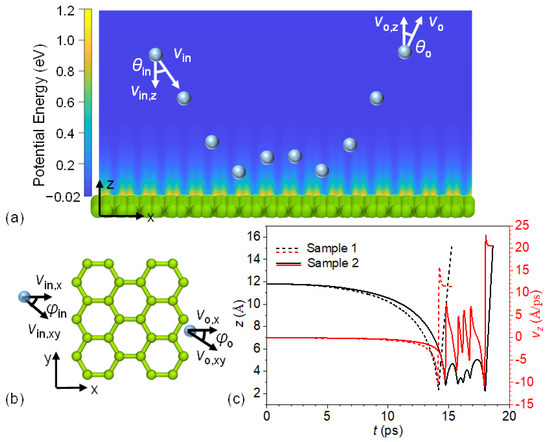 (a) An illustration of a sampling system composed of a helium atom (blue sphere) and monolayer graphene (green sphere layer). The multiple blue spheres illustrate one trajectory of a helium atom scattered on the graphene surface. The background shows the potential energy of the system relative to the case where the helium atom is 20 Å from the graphene surface. θ and V stand for the polar angle and the velocity of helium. The subscripts “in” and “o” denote the incident and scattered helium, respectively. (b) Top view of the helium–graphene system. ϕ denotes the azimuth angle, and the subscript “xy” represents the in-plane component. (c) Two characteristic examples of the scattering process of helium on monolayer graphene. The black curves are the distances of helium atoms from the top surface of the graphene, and the red curves are the normal velocity components of helium.