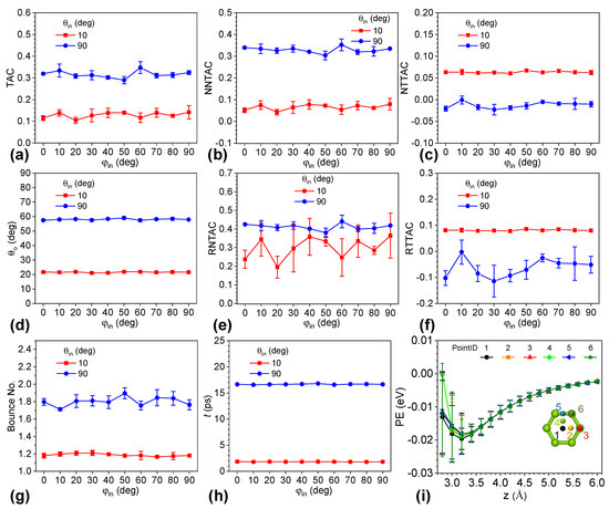 The zenith angle of scattered helium (θo), average bounce number of helium, and interaction time of helium with graphene (t) were plotted with the various azimuthal angles in Figure 3d,g,h, respectively. The values of θo for a θin of 10° ranged between 21.056° and 21.932°, while the range of θo for a θin of 90° was from 57.463° to 59.042°. The variance in both cases was less than 4% and was much smaller than the change in TAC.
