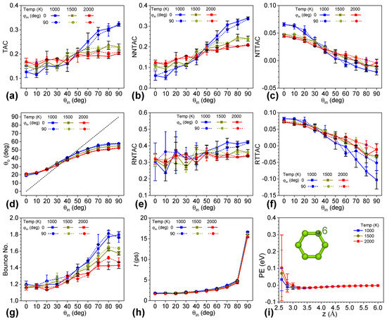 Figure 6g–i display the corresponding zenith angle of scattered helium, bounce number, and interaction time of helium with graphene. Given a graphene temperature of 1000 K, θo increased from 31.23° to 39.32°, 42.62°, and 44.55° as helium temperature increased from 100 K to 700 K. The higher the temperature of helium, the closer its scattering behavior approached the expected value, 45.55°, of the incident zenith angle. Furthermore, θo decreased from 42.62° to 40.78° and 39.14° when increasing the graphene temperature from 1000 K to 1500 K and 2000 K, respectively, and fixing the temperature of helium at 500 K. These data indicate that θo became closer to the expected value of θin upon reducing the temperature difference between helium and graphene. Contrary to common wisdom, Figure 6h,i demonstrated that higher bounce numbers and interaction times of helium with graphene could not guarantee a higher energy transfer between helium and graphene. When the graphene temperature was fixed at 1000 K, the bounce number of helium decreased from 1.70 to 1.52, 1.39, and 1.32 for helium temperatures of 100 K, 300 K, 500 K, and 700 K, respectively. In this case, the interaction time declined, which was consistent with the trend for the bounce number. However, this trend was opposite to that for the TAC. On the other hand, the bounce number and interaction time decreased with higher graphene temperatures, which agreed very well with the trend for the TAC.