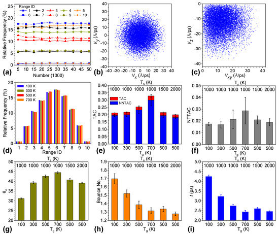 (a) Convergence analysis of the relative frequency of the zenith angle of incident helium. Range ID of 1 to 10 represents zenith ranges of [0°,5°], [5°,15°], … [85°,90°]. For each middle range ID, the interval width was 10°. (b) Scatterplot of in-plane velocity components of sampled incident helium. (c) Scatterplot of normal and in-plane velocity components of sampled incident helium. (d) Converged relative frequency in various ranges of θin for helium with different incident speeds. (e) TAC and NNTAC and (f) NTTAC for systems with various graphene temperatures denoted by top tick labels and helium incident speeds shown by bottom tick labels. (g) Zenith angle of scattered helium, (h) bounce number, and (i) interaction time of helium for various systems.
