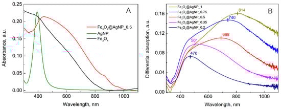(A) Absorption spectrum of magnetite NPs (black), silver NPs (green), and magnetite NPs decorated with silver NPs (Fe3O4@AgNP_0.5; red); (B) the differential spectra of various amounts of AgNP-decorated magnetite, calculated by subtracting magnetite absorption spectra from each sample with decorated NPs.