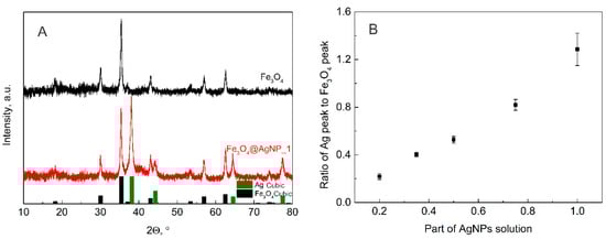 (A) XRD diffractograms of magnetite NPs (black) and magnetite NPs decorated with the highest amount of AgNPs (Fe3O4@AgNP_1; red); Crystallography Open Database files of magnetite (No. 9007644) and silver (No. 5000218) are presented in black and green columns, respectively. (B) Ratio of the main magnetite (35.4°) and silver (38.2°) peak intensities calculated for the different volume of AgNP solution used in decoration of magnetite.