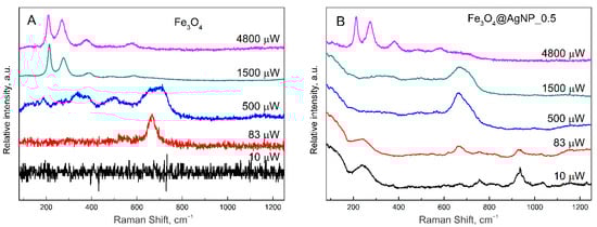 Raman spectra of (A) magnetite nanoparticles and (B) magnetite nanoparticles decorated with silver nanoparticles (Fe3O4@AgNP_0.5) at different laser powers from 10 μW to 4.8 mW. Spectra were taken at 532 nm laser light on the nanoparticle samples dried on glass substrate.
