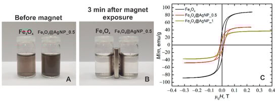 A study of the magnetic properties of the particles has shown that Fe3O4 particles decorated by AgNPs remain ferromagnetic. This is evidenced by the experiments using permanent magnets as well as the magnetization studies. Figure 5A,B shows an experiment in which Fe3O4 and Fe3O4@AgNP_0.5 nanoparticles were suspended in water (see Figure 5A) and placed in a permanent magnetic field (see Figure 5B). The permanent magnet in this case was placed to the side of the bottles with these solutions. As we can see, in both cases all the particles were attracted to the side of the bottles at the location of the magnet. After three minutes from the beginning of the experiment, the solution in both bottles became transparent. This proves that, using the given decoration method, all the AgNPs have adhered to the Fe3O4 particles and that the Fe3O4 particles do not lose their ferromagnetic properties after decoration.
