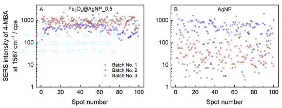 Drying the colloid solution droplet on a surface resulted in the accumulation of non-volatile solutes at the edge of the drop—an effect known as the “coffee ring” [,]. Such an accumulation leads to an uneven distribution of material, which in the case of plasmonic nanoparticles has already been shown to reduce the repeatability of the SERS signal and the overall spectral intensity [,]. When composite magneto-plasmonic nanoparticles are dried in a strong magnetic field, their distribution on a surface becomes highly homogeneous, as can be seen in the right-hand side image in Figure S4. Dried AgNPs and Fe3O4@AgNP_0.5 colloid droplets were adsorbed with 4-MBA and measured at 100 different locations on the sample surface; the intensities of the dominant band at 1587 cm−1 were plotted in Figure 7. The SERS enhancement reproducibility could be quantified by the relative standard deviation (RSD), which allows for the accessing of both the spot-to-spot reproducibility within a single sample and the sample-to-sample reproducibility amongst the different nanoparticle preparations. We found Fe3O4@AgNP_0.5 to exhibit a much greater spot-to-spot reproducibility, with values ranging from 27 to 44% for individual batches, compared to the AgNPs, with the RSD varying from 62 to 496%. Addressing the reproducibility between the different nanoparticle batches (sample-to-sample reproducibility), the intensity deviations were also higher for the bare silver nanoparticles; accordingly, the RSDs were 88% and 37% for the AgNPs and Fe3O4@AgNP_0.5.