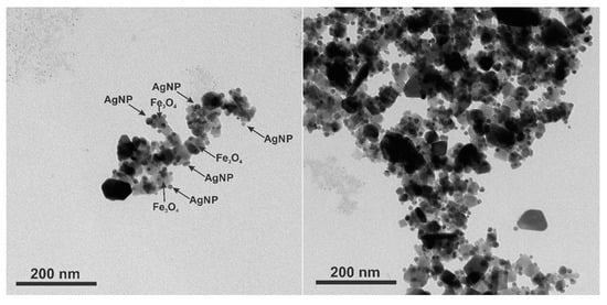 TEM images were made to see how the silver nanoparticles were adsorbed on the surface of the magnetite (Figure 8). The Fe3O4 nanoparticles of 50 nm average diameter are attached with 13 nm AgNPs. The ability to control the number of AgNPs per one magnetic nanoparticle by simply adding different volumes of AgNPs to the Fe3O4 solution brings a practical aspect to the ability to tune the plasmon resonance intensity and frequency to match the given laser excitation. This has already been illustrated by the optical properties in Figure 2B, and now, we present the complementing multiwavelength-SERS results. The SERS enhancement factor (EF) is