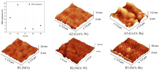 - Surface topology characterization: SEM images pointed out the surface morphology changes for the Cr2O3 and SiO2 oxides, while grain agglomerations promoting pore formations were observed for SiO2: Be configuration; Co-deposition with W could mitigate the RMS factor and homogenize the surface, as determined from the AFM measurements;