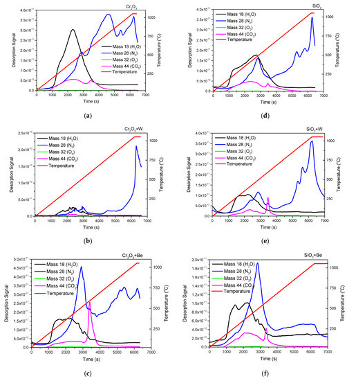 - Elemental distribution expressed as wt.% concentration was measured using EDX for oxide configurations (except SiO2: Be), thus evaluating the stoichiometry (O and W content); while TDS data suggest that the presence of an oxide bond at the surface has led to higher desorption peak temperatures observable for N2, excepting SiO2: Be. Moreover, defects present in the Cr2O3 matrix determined a significand desorption of H2O at 400 °C;
