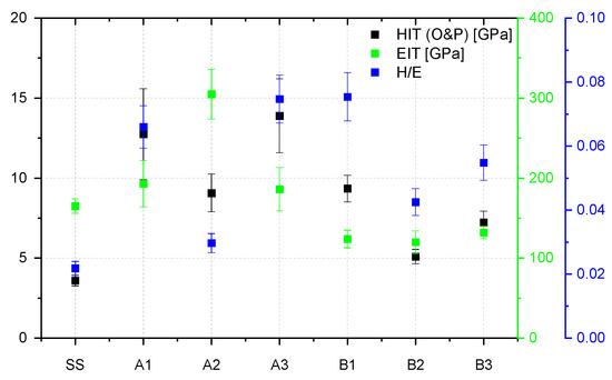 - Oliver, W.C.; Pharr, G.M. Measurement of hardness and elastic modulus by instrumented indentation: Advances in understanding and refinements to methodology. J. Mater. Res. 2004, 19, 3–20. [Google Scholar] [CrossRef]