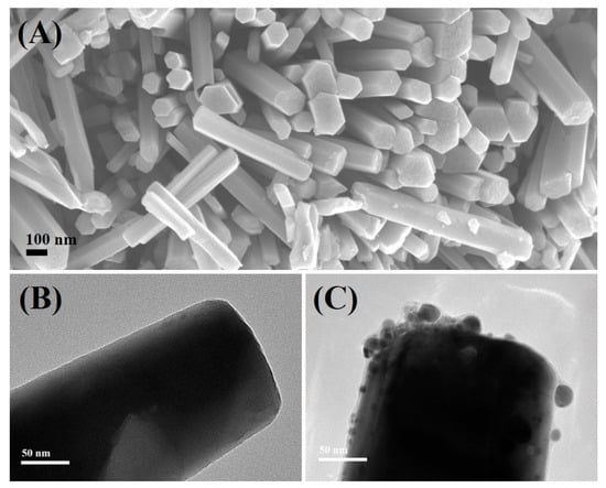 APTES-modified ZnO NRs contain amino groups that can attract Ag ions/NPs to the surface, resulting in the formation of a composite structure as described elsewhere [19,20,21]. The use of a strong reducing agent such as sodium borohydride guarantees the formation of pure Ag NPs on ZnO surface. Figure 1A depicts an SEM image of as-prepared ZnO NRs. Size analysis revealed that the lengths of ZnO NRs were in the ~700–1100 nm range, while the widths were mostly in the ~70–190 nm range. Figure 1B shows a TEM image of an as-prepared single ZnO nanorod edge with a smooth surface. Figure 1C shows the successful modification of ZnO NRs with irregularly distributed quasi-spherical Ag NPs (~5 to 24 nm).