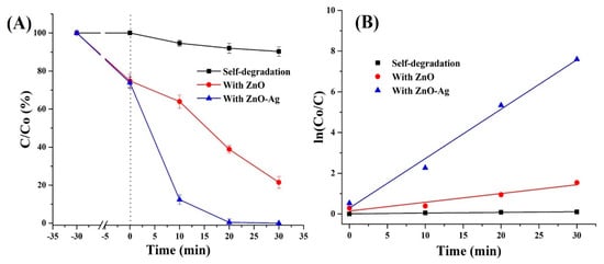 The photocatalytic activity of bare ZnO and ZnO-Ag NRs was further compared using RB dye as a model pollutant in water. The pH of the RB dye solution was kept at ~7, because ZnO is an amphoteric material that can be degraded at lower or higher pH ranges [24]. Figure 3A depicts the photodegradation kinetics (C/Co vs. time) of bare RB dye and in the presence of ZnO and ZnO-Ag NRs. The RB dye concentration remained unchanged after 30 min in the dark, and ~9.7% of RB dye degraded after 30 min of direct solar illumination. In contrast, ZnO and ZnO-Ag NRs adsorbed ~25–26% of the RB dye after 30 min in the dark. However, the photocatalytic activity of both samples was found to be drastically different when exposed to solar light. In particular, after 30 min of illumination, ZnO NRs can degrade ~78.5% of the RB dye, whereas ZnO-Ag NRs can degrade ~99.5% in only 20 min. Corresponding UV-Vis curves are plotted in Figures S3–S5 (Supplementary Information). Figure 3B shows the fitting curves for all three curves. The following equation [25] was used for fitting: