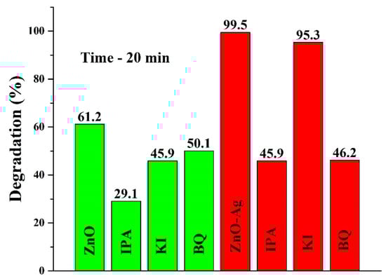 Various metal oxides have been routinely tested as photocatalysts in dye degradation experiments to date. Among them, ZnO semiconductor has attracted the scientific community’s interest due to its low price, ability to control the size and shape, and the possibility to use it in a broad range of applications, including photocatalysis [4,5], dye and pesticides removal [6,7], gas sensing [8], water splitting [9], and so on. On the other hand, ZnO has a high bandgap (Eg~3.37 eV) and can thus be activated by UV photons only. In this regard, ZnO is often sensitized with plasmonic metallic NPs such as Ag, Au, and Pt to improve the absorption of the photons in the visible light region. Owing to their lower cost, Ag NPs are more commonly used as compared to Au or Pt NPs. There are a number of studies available in the literature that describe the preparation and use of ZnO-Ag nanostructures. ZnO-Ag nanostructures, for example, have been found useful for water disinfection [10], as antibacterial agents [11], and for photodegradation of organic pollutants in water, such as 4-nitrophenol [12,13] and organic dyes [14,15,16]. It is widely accepted that charge separation plays an important role in improving the photocatalytic activity of ZnO-Ag nanostructures; however, this statement is typically tested solely through the photoluminescence (PL) study [14,16], which is not enough for a complete description of the photocatalytic mechanism. For example, PL analysis showed a similar trend for two recent works [15,17], i.e., PL peaks of intensity decreased, implying better charge separation in ZnO-Ag structures. Given the very similar preparation methodology of ZnO-Ag, one would expect photocatalytic mechanisms to be similar; however, it was not confirmed in practice. For instance, X. Zhu and colleagues [15] revealed that ˙O2− radicals are mainly responsible for the photodegradation process, whereas A.N. Kadam and colleagues [17] showed that the main reactive species involved in dye degradation were ˙OH and ˙O2− radicals. Hence, the use of radical scavengers can be an effective method for elucidating the photodegradation mechanisms, but this methodology is rarely employed for metal oxide nanostructures sensitized with plasmonic nanostructures.