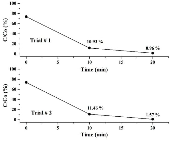 Another important factor to consider is photocatalyst reusability in order to decrease treatment costs and prevent secondary pollution. The reusability of the collected ZnO-Ag photocatalyst was tested three times, which were denoted as base trial (first run), trial # 1 (second run), and trial # 2 (third run). Figure 5 depicts how photodegradation decreases with each new trial, i.e., ~99.5% (base trial), ~99.0% (trial # 1), and ~98.4 % (trial # 2). The loss of photodegradation activity can be attributed to a variety of factors, such as overall loss of photocatalysts during the collection process and possible detachment of Ag NPs. Nonetheless, the photocatalytic activity of the ZnO-Ag photocatalyst remains high even after three cycles, indicating its good potential for reusability.