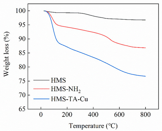 TGA is frequently used to determine the thermal stability and decomposition pattern of materials. The TGA curves of HMS, HMS-NH2, and HMS-TA-Cu are illustrated in Figure 4. In the temperature range studied, HMS is thermally stable and without significant weight variation. For HMS-NH2 and HMS-TA-Cu, the TGA curves have a large amount of variation with temperature. It can be clearly seen that after heating the samples up to 800 °C, HMS, HMS-NH2 and HMS-TA-Cu show a gradually increased mass loss of 3.3%, 13.3%, and 23.2%, respectively, which is further evidence of the successful functionalization of HMS [26].