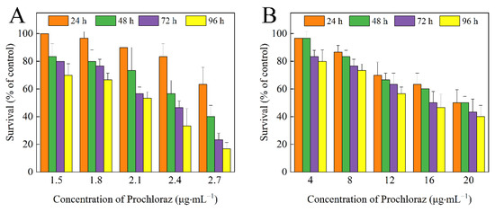 Figure 9. The survival of zebrafish treated with prochloraz technical (A) and Pro@HMS-TA-Cu nanoparticles (B) at 24, 48, 72, and 96 h.