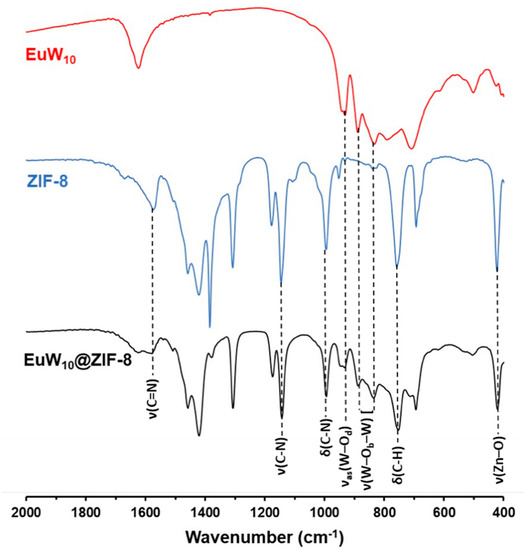 The resulting EuW10@ZIF-8 composite material was characterized using several techniques, including Fourier transform infrared spectroscopy (FT-IR), powder XRD, thermogravimetric analysis (TGA), inductively coupled plasma–optical emission spectrometry (ICP-OES) and scanning electron microscopy (SEM) coupled with energy dispersive X-ray spectroscopy (EDS). The FT-IR spectrum of EuW10@ZIF-8 (Figure 1) exhibits the typical bands arising from the ZIF-8 framework, namely the bands associated with the stretching modes of the C=N and C–N bonds located 1577 and 1144 cm−1, respectively. The bands located at 993 and 752 cm−1 are ascribed to the bending modes of C–N and C–H bonds, respectively, while the band at 692 cm−1 arises from the out-of-plane bending of the ring. The band located at 420 cm−1 is assigned to the stretching vibration of the Zn–N confirming the coordination between the metal center and organic ligand [63,64]. The presence of additional bands can be observed in the spectrum of the composite when compared with the spectrum of ZIF-8. These bands are located at 937 cm−1, which can be assigned to the terminal νas(W–Od) stretching mode, as well as at 887 and 835 cm−1, ascribed to the corner-sharing ν(W–Ob–W) stretching modes of EuW10, respectively [60,65,66,67]. Moreover, the presence of the europium POM in the composite material was further confirmed by elemental analysis (ICP-OES). The results reveal a tungsten amount of 28.6 wt%, leading to a EuW10 loading of 0.156 mmol per g, which confirms the successful immobilization of the POM onto the porous ZIF-8 structure.