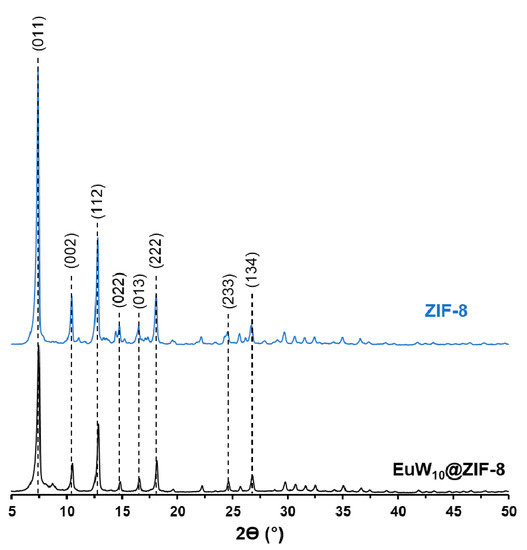 The crystalline structures of EuW10@ZIF-8 composite and the solid support were investigated by powder XRD. Figure 2 exhibits the patterns of both materials in the 5 < 2θ < 50° range. The results reveal highly crystalline materials with nearly identical diffraction patterns composed by the characteristic diffraction peaks of the ZIF-8 crystalline structure. The main diffraction peaks located at 2θ = 7.4, 10.5, 12.8, 14.9, 16.6, 18.2, 24.7 and 26.8° can be indexed to the (011), (002), (112), (022), (013), (222), (233) and (134) reflections. The high similarity between the diffraction patterns points out to the stability of the MOF by retaining its crystalline structure after the EuW10 incorporation process. Although an additional low-intensity peak can be detected at 2θ = 8.7°, the main diffraction peaks of EuW10 are absent from the EuW10@ZIF-8 pattern, suggesting its homogenous distribution within the MOF framework [68,69].