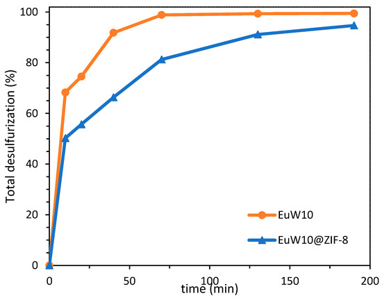 The catalytic performance of the composite EuW10@ZIF-8 was investigated for the desulfurization of a multicomponent model fuel prepared with the most representative refractory sulfur compounds in real diesel, namely dibenzothiophene (DBT), 4-methyldibenzothiophene (4-MDBT) and 4,6-dimethyldibenzo-thiophene (4,6-DMDBT). Catalytic studies were performed at 70 °C in a biphasic liquid–liquid system based on equal volumes of the extraction solvent 1-butyl-3-methylimidazole hexafluorophosphate ([BMIM]PF6) and the model fuel. Aqueous hydrogen peroxide was used as oxidizing agent. The desulfurization process occurred in two main steps: extraction and catalytic oxidation. During the first 10 min and before the addition of oxidant, an initial extraction occurs to transfer certain amount of the sulfur compounds from fuel to the [BMIM]PF6 phase. The initial extraction equilibrium is reached, and the second step is initiated by adding hydrogen peroxide oxidant to the system. The metal-catalyzed oxidation of the extracted sulfur compounds is initiated (i.e., the oxidation of sulfur compounds to the corresponding sulfoxides and/or sulfones presented in the extraction solvent). The sulfur oxidation promotes a continued sulfur extraction from the diesel phase by decreasing the concentration of non-oxidized sulfur compounds in the extractant phase since no oxidation products were detected in the model diesel phase. The mechanism involved in the oxidation of benzothiophene and dibenzothiophene derivative compounds involved an initial formation of peroxo-POM active species via nucleophilic attack of the oxidant on the WVI atoms of EuW10. Oxidation of sulfur compounds into sulfoxides occurs by transfer of an oxygen atom from the intermediate active species, which are then regenerated into the initial WVI species. Subsequent nucleophilic attack on sulfoxides leads to the formation of the corresponding sulfones [9,25,27,41,43]. The desulfurization efficiency was determined by the periodical analysis of the model fuel phase by gas chromatography. Pristine ZIF-8 was tested as catalyst showing no activity in the studied reaction. Initially, the catalytic activity of the EuW10@ZIF-8 composite was compared with the homogeneous EuW10 (Figure 4). The desulfurization profile reveals a considerable extraction of sulfur compounds during the initial extraction step (50.2% and 68.3% of desulfurization for the heterogeneous EuW10@ZIF-8 and the homogeneous EuW10, respectively). Both catalysts were also demonstrated to be highly efficient for the desulfurization of the sulfur multicomponent model fuel. After 3 h of the process, near-complete desulfurization was achieved using the EuW10@ZIF-8 composite (94.7%). The homogeneous EuW10 was shown to be slightly more efficient than the composite, since after only 1 h, a desulfurization of 98.9% was achieved. The individual desulfurization for each sulfur compound in the presence of EuW10@ZIF-8 is depicted in Figure 5. The difficulty to remove the sulfur compounds from the model fuel increases according to the following order: DBT > 4-MDBT > 4,6-DMDBT, which is in good agreement with previously reported studies [4,74,75]. This tendency is correlated with the steric hindrance introduced by the methyl groups that hinders the nucleophilic attack, delaying the oxidation of the sulfur compounds to sulfoxides and/or sulfones. In fact, the removal of DBT from the model fuel was greatly promoted, with complete desulfurization being achieved after only 2 h. As for 4-MDBT, nearly total desulfurization (97.2%) was achieved after three hours of reaction, while only 87.9% was achieved for 4,6-DMDBT. Despite the superior catalytic activity of the homogeneous catalyst, a major drawback is its inability to be removed from the reactional medium and recycled in consecutive catalytic cycles.