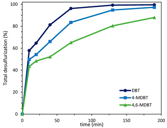 Desulfurization profile for the individual sulfur components present in the multicomponent model fuel (DBT, 4-MDBT, 4,6-DMDBT) catalyzed by the heterogeneous EuW10@ZIF-8 (containing 3 µmol of EuW10 active center) using [BMIM]PF6 as extraction solvent and H2O2 as oxidant, at 70 °C.
