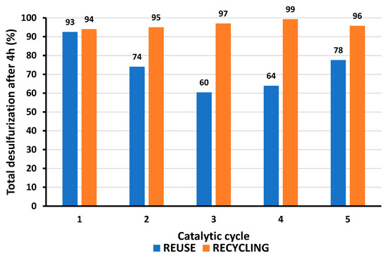 The recycling capacity of the solid EuW10@ZIF-8 catalyst and the reuse ability of the EuW10@ZIF-8/[BMIM]PF6 system were evaluated by performing five consecutive desulfurization cycles. The reuse method consisted of the preservation of the composite and the ionic liquid-phase EuW10@ZIF-8/[BMIM]PF6 during five consecutive cycles. The sustainability of this procedure is higher, since the same portion of extraction solvent and catalyst were used in these consecutive cycles. After each cycle, the model fuel was removed from the system and a new desulfurization cycle was performed by adding a novel portion of sulfurized model fuel as well the H2O2 oxidant, maintaining all the experimental conditions. In the case of the recycling procedure, the solid catalyst was recovered, washed with water and acetonitrile, dried, weighed, and used again in a new desulfurization cycle while maintaining the same experimental conditions. Figure 6 displays the results obtained after 4 h for the reusing and recycling processes. It is noteworthy that the recycling process of EuW10@ZIF8 demonstrates the retention of the desulfurization efficiency during the various cycles, with near complete desulfurization after 4 h. On the other hand, the reuse process of the EuW10@ZIF8/[BMIM]PF6 system presented a decrease in catalytic efficiency after the first cycle. Between the 2nd and the 4th cycles, the reuse process caused an accumulation of oxidized products (mainly sulfones) in the [BMIM]PF6 extraction phase. This caused a decrease in sulfur transfer from the fuel to the ionic liquid phase, and consequently a decrease in the desulfurization efficiency. This behavior has been attributed to the accumulation and consequent saturation of the extraction phase during the reuse process with the oxidized sulfur compounds (sulfones), which prevents further transfer of sulfur compounds from the non-polar phase (model diesel) to the ionic liquid phase, decreasing the desulfurization efficiency of the system [27,76]. After the 4th cycle, the solid catalyst was recovered, washed, and used in a new desulfurization cycle. This promoted an increase in desulfurization efficiency, which was observed for the 5th cycle of the reuse process. Therefore, the results show that the saturation of the extraction phase prevents the reutilization of the solid catalyst for longer desulfurization cycles, since the oxidative reaction should occur in the extraction phase (sulfones and/or sulfoxides were observed in the model fuel phase), and a clean medium promotes a higher diffusion of reactants to the catalytic active center located at the ZIF-8 framework.