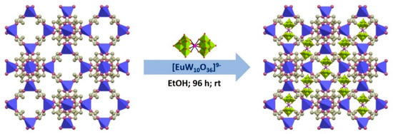 The preparation of the composite was performed through the immobilization of the EuW10 in the porous ZIF-8 support through an impregnation procedure for POM@MOF composites [52,53,62]. The procedure consisted of the preparation of an ethanolic solution of EuW10 (90.2 mg; 0.031 mmol), followed by the addition of previously dried ZIF-8 (150 mg) and stirring of the mixture for 96 h at room temperature. The product was recovered by centrifugation, washed with MeOH, and dried in a desiccator over silica gel.