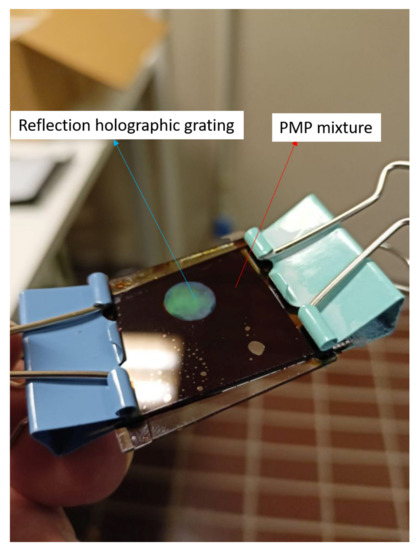 PMP mixture is inserted by capillarity in the sandwich containing the recorded grating. In a few minutes, the PMP-mixture surrounds the spot containing the grating. The system is furthermore polymerized by irradiation with a UV-A lamp ( = 365 nm; P = 0.5 W) for 20 min to form the PMP-DFB film [79]. After that the cell is placed in the DFB-laser set-up.