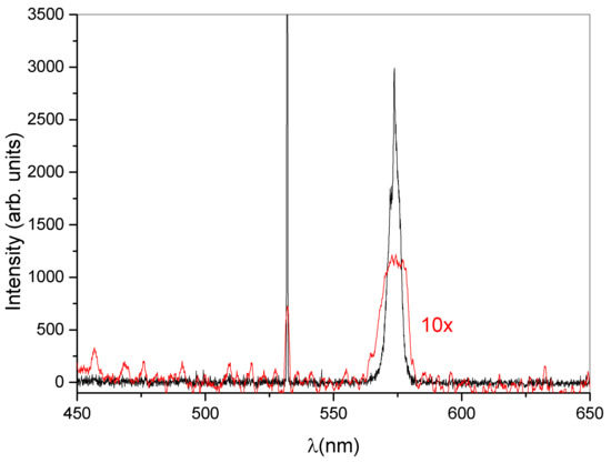 Lasing from the DFB structure under pulsed pumping at = 532 nm, pumping energy = 120 mJ. The narrow peak on the left side is due to the pump beam. The red line represents a 10× magnification of the typical emission spectrum of our mixture when pumped at low power values.