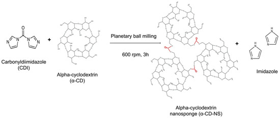 Following the synthesis described by Pedrazzo et al. [21], α-CD was dried in an oven at 100 °C until constant weight. The one-step, solvent-free synthesis was performed using a Retsch PM100 planetary ball mill (Haan, Germany) and CDI as a cross-linking agent in a 50 mL zirconium oxide jar with 10 zirconium oxide balls of 10 mm. The amount of α-CD and CDI to achieve the chosen 1:4 molar ratio was 3.38 and 2.25 g, respectively. After 3 h of 600 rpm sun wheel speed rotation, changing the direction of rotation every 15 min, the synthesis was completed (Figure 1). Once washed, the product was filtered on a Buchner funnel using a 0.2 µm mixed cellulose ester Whatman membrane filter (Maidstone, UK). Then, it was left to dry in an oven at 50 °C until a constant weight was achieved. Afterward, the dried α-CD-NS were stored in a desiccator to prevent moisture uptake.
