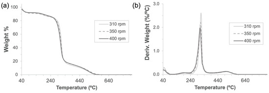 Thermogravimetric analyses (a) and their derivatives (b) of α-CD-NS obtained through 3 h of mechanochemical (ball mill) synthesis at 310, 350, and 400 rpm using a 500 mL zirconia jar.
