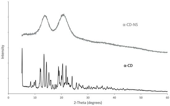 A comparative analysis of the XRD diffraction patterns (Figure 4) was used to observe the differences in the spectra of α-cyclodextrin and the cross-linked α-cyclodextrin nanosponges. α-CD showed clearly defined reflections with sharp peaks, which confirmed its crystalline structure. However, the diffractogram of α-CD-NS had two wide peaks with maxima at 13.9° and 20.7°, which corresponded to an amorphous polymer structure. This phenomenon, which further characterizes α-CD-NS, has been observed for similar materials [31].