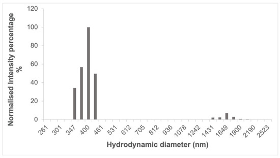 After washing, the particle size of the cross-linked cyclodextrins (Figure 5) was around 400 nm as determined by DLS, having a polydispersity index of 0.222 ± 0.015, which is in line with what has been previously reported for cyclodextrin-based complexes after a wet milling cycle using a planetary ball mill [32]. In the case of cyclodextrin polymers that did not undergo a ball milling process, similar size measurements could only be achieved on the supernatant of a centrifuged dispersion [33].
