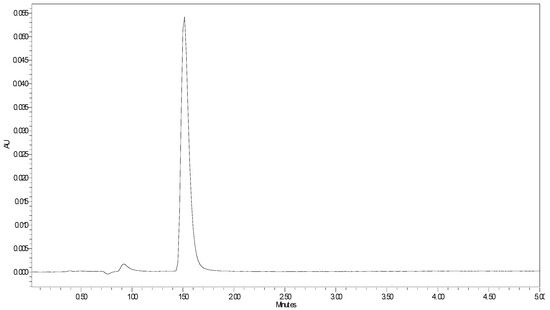 Several methods have been reported for the determination of imidazole derivatives using a different range of analytical techniques. However, none of them focus on just the determination of free imidazole. Zhu and collaborators reported a UV method for the determination of imidazole and two imidazole derivatives using high-performance liquid chromatography [24]. Considering this method as a starting point, we aimed at developing a faster, cheaper, more easily accessible, and precise method that would allow imidazole monitoring in α-CD-NS, even at very low concentrations using high-performance liquid chromatography (HPLC) coupled to a Diode Array Detector. In this way, the validated method will allow us not only to analyze imidazole in the synthetized α-CD-NS but also to evaluate a possible residual imidazole release when the α-CD-NS are applied as ethylene scavengers in contact with foods. The method was validated in terms of linearity, intermediate, intra- and interday precision, and accuracy, following a 5-day validation protocol according to FDA and ICH guidelines. The described chromatographic conditions produced a peak eluting at 1.48 min (Figure 7). To evaluate the method’s linearity, five replicates of eight evenly distributed calibration standards ranging from 0.1 to 10 µg g−1 were prepared gravimetrically and analyzed as described above. For intermediate precision evaluation, three quality control (QC) samples at low (LQC: 2 µg g−1), medium (MQC: 4 µg g−1), and high (HQC: 6 µg g−1) concentrations (n = 3) were also analyzed each day. Calibration curves were obtained by plotting peak area against concentration. The acceptance criteria involved a Pearson coefficient of at least 0.999 and the calibration standards’ accuracy within ±10%. To generate the best data for the chosen calibration range, six weighing factors (1/√x, 1/x, 1/x2, 1/√y, 1/y, 1/y2) were evaluated. Linearity data can be found in Table 1. The weighting factor 1/x was chosen since the sum of relative errors was smaller while still presenting a mean R2 value of at least 0.999. The limit of detection and quantification were calculated using a 25 ng g−1 standard and were 3.07 ng g−1 and 10.24 ng g−1, respectively, which is considerably lower than previously reported [24], meaning that very low concentrations of imidazole contaminant can be effectively detected in the finished product.