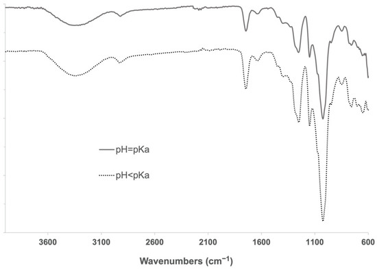 During the cross-linking reaction, CDI generates two molecules of imidazole, which are known to be able to catalyze the hydrolysis of ester bonds at different rates when being in its neutral form (imidazole pH = pKa) [35]. To determine a possible negative influence of pH in imidazole-induced hydrolysis of α-CD-NS, two washing protocols (8 h at 40 °C under constant stirring) at pH = pKa (neutral, reactive) and pH < pKa (protonated, unreactive) were compared. Two identical amounts of the synthesized product were washed, and their pH was monitored every hour. One of the washing solutions was maintained at a constant pH of 6.9, equal to imidazole’s pKa. To the other solution, concentrated hydrochloric acid was added when necessary to keep a constant pH of 6.0. After filtering and drying, the same yields (99.5%) were obtained. FTIR-ATR and TGA of the two washed products (Figure 8 and Figure 9) did not reveal any differences between the ratio of the area of the carbonyl band at 1750 cm−1 and the water bending band at 1640 cm−1, as well as in the thermogravimetric kinetics of the samples. This indicates that no molecular structure differences were produced during both washes at pH = pKa and pH < pKa, and, therefore, pH control is not required through the washing step.