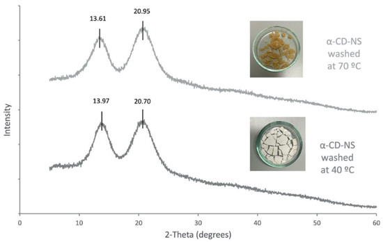 As the α-CD-NS washed at 70 °C looked similar to a crystalized powder, an X-ray diffraction analysis was performed on α-CD-NS washed at 40 °C and 70 °C (Figure 11). Both diffractograms showed a disordered crystal structure corresponding to an amorphous structure, as already described in Figure 4. The X-ray diffractogram maxima obtained for the α-CD-NS washed at 40 °C (Figure 11) are the same as the ones obtained in Figure 4, indicating that the washing at 40 °C did not affect the αCD-NS amorphous structure. However, a subtle shift could be observed in the maximum of both broad peaks, suggesting a significant change within the amorphous structure, as the shifts were not all unidirectional.