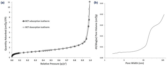 As α-CD-NS are formed by either the inner cavities of alpha-cyclodextrin or the outer cavities of the cross-linked network, we evaluated α-CD-NS porosity in an attempt to understand how ethylene could be absorbed by α-CD-NS. The porosities and pore sizes of α-CD-NS were examined by their N2 adsorption/desorption isotherms (Figure 12). The isotherms displayed a typical type II profile corresponding to the unrestricted monolayer-multilayer adsorption expected for non-porous or microporous adsorbent materials. The specific surface area was 3.90 m2 g−1, and the average pore diameter was 10.46 nm. The pore volume of pores less than 98 nm in width was 0.010 cm3 g−1. This high surface area match has been previously reported for other cyclodextrin monomers [38], suggesting polymerization does not have an effect on surface area increase. Moreover, the data suggest that the presence of macropores (>50 nm) within the cyclodextrin polymeric network would likely impede α-CD-NS from outperforming their monomer counterparts as ethylene scavengers if not for their higher physical and chemical stability and water insolubility, which is a major concern when developing products intended to be in contact with fruit, as they require high humidity environments (≥90% relative humidity).
