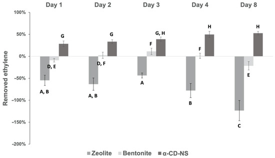 Ethylene removal percentage of α-CD-NS and commercial bentonite and zeolite across time. Mean ± SD of three replicates is shown. Different letters show significant differences (p ≤ 0.05) between samples.