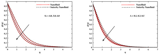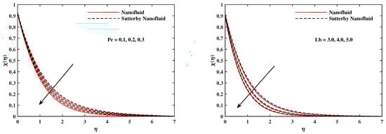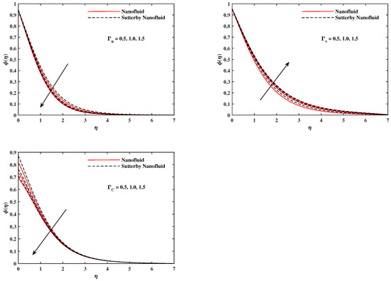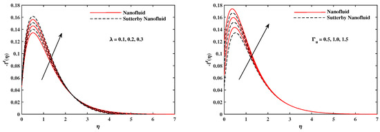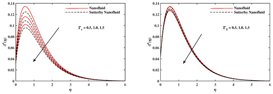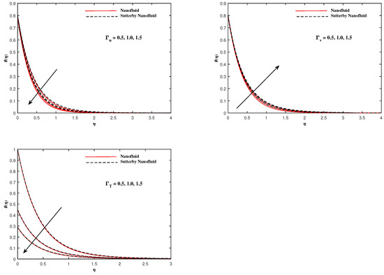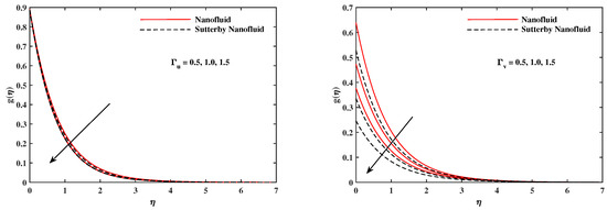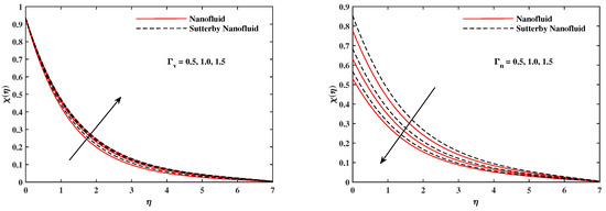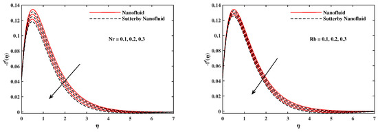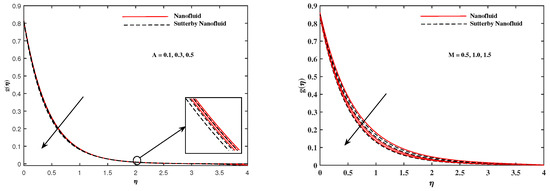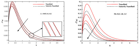 The plots in Figure 2, Figure 3, Figure 4, Figure 5, Figure 6 and Figure 7 delineated the distribution of velocities and with a variation of leading parameters for two cases of nanoliquids and Sutterby nanofluids. It is revealed that the speed for Sutterby fluids is significantly slower than ordinary nanofluids. The larger viscous effects for Sutterby fluids impede the flow notably at the face as compared to that of nanofluids. The parabolic curve of rises upward near the boundary due to the stretching cone and then it declines to far-off boundary conditions. Figure 2 portrays the slowing behavior of x-velocity against mounting inputs of unsteadiness and magnetic parameters. In the presence of the magnetic force field, the reactive Lorentz force comes into play and retards the flow (see [31]). In unsteady flow, after the first jerk, the stretch in boundary diminishes and the fluid in the boundary slows down. It is observed that raising the unstable parameter drops the velocity distribution, which is associated by a decrease in the momentum boundary layer thickness in the profile, indicating that the unsteadiness factor declines the fluid velocity due to the spinning cone. From Figure 3, the slowing of fluid velocity is caused by the growing strength of and . The buoyancy effects put forth an adverse reaction to the flow in x-direction; hence, decline. Vivid progress in x-velocity is demonstrated in Figure 4 when mixed convection parameter and u-velocity slip parameter are improved. However, the higher inputs of v-slip velocity and thermal slip decrease the speed , as depicted in Figure 5. A meager decline in y-velocity is revealed against the unsteadiness seen in Figure 5. Moreover, Figure 6 and Figure 7 show the significant decrement of y-velocity when magnetic parameter M, u-velocity slip, and v-velocity slip parameters are made stronger. The sketch for temperature function for nanofluids and Sutterby nanofluids is shown in Figure 8, Figure 9 and Figure 10. It is observed that temperature for Sutterby nano-fluids is higher than that of nanofluids. In addition, Figure 8 indicate that temperature diminishes against the rising inputs of Prandlt number and unsteadiness parameter A. This is due to the notion that enhancing unsteadiness improves heat loss due to the rotating cone, leading to a reduction in temperature distribution. Regardless of the reduction in the rate of heat transmission from the surface to the fluid for larger values of the unstable parameter, the cooling rate is significantly faster than the rate of cooling for the steady flow. However, the larger inputs of the parameter for Brownian motion and thermophoresis improves temperature distribution , as delineated in Figure 9. According to the physical nature of these two slip conditions, the rise in temperature is expected. The fast random motion of nano-particles in the base fluids (higher value of ) and the rapid movement of nanoentities from hotter to colder fluids (higher values of ) are responsible for raising temperature . Figure 10 expose that fluids temperature is reduced against higher values of u-velocity slip and thermal velocity slip , but it rises directly with v-velocity slip . The normalized function of nano-entities’ volume friction is mapped in Figure 11, Figure 12 and Figure 13. Volume friction recedes against , A, and but it becomes enhanced with the increments in , the thermophoretic parameter. Furthermore, u-velocity slip and solutal slip exert a receding impact on , whereas v-velocity slip enhances volume friction . The plots of micro-organism density exhibit decrement in this function against the increment in Peclet number and Lewis number , as shown in Figure 14. Similarly, Figure 15 displays a decreasing trend of against u-velocity slip and unsteadiness parameter A. Figure 16 reveals that micro-organism density increases with v-velocity slip parameter , and it declines rapidly when motile density slip is improved. Table 2 and Table 3 in the respective order presents the enumeration of skin friction factors in x-direction and y-direction. Skin friction along x-direction continues to decrease against parameter A, S, M, , and , but it is enhanced directly with mixed convection parameter . Moreover, parameter A, S, and M incremented with but parameter was reduced significantly. Table 4 enlists the local temperature rate on the cone surface to be reduced against , , and but it increases with A and . From Table 5, it is perceived that increases with A, , but it decreases against and . Results for are registered in Table 6. Parameters A, , and enhance , but it diminishes against .
