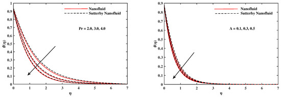 - A rising trend is observed in temperature profile when , , and take larger values but it decreases when , A, , and are uplifted.