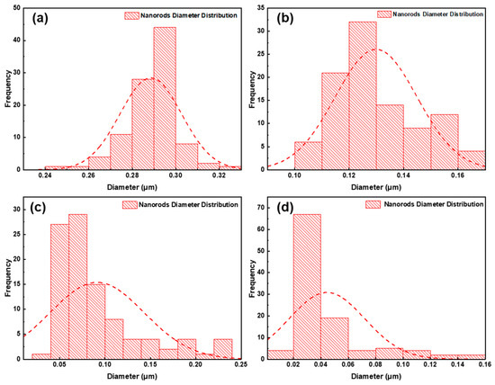 Distribution of TiO2 nanorods diameter in (a) 0 M KBr, (b) 0.05 M, (c) 0.1, (d) 0.15 M samples.