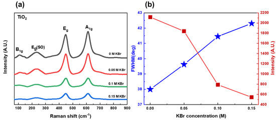 (a) Raman spectra of TiO2 nanorods grown hydrothermally with different KBr concentrations (0 M; 0.05 M; 0.1 M; and 0.15 M). (b) FWHM and intensity of Eg active mode peak as a function of KBr concentration.