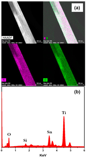 To explore the microstructure of the grown TiO2 NRs, TEM analysis was carried out for the sample with 0.05 M KBr. X-ray energy dispersive spectroscopy (EDS) elemental mapping was performed to give better understanding about the chemical composition of the nanorods, as shown in Figure 5a. The mapping confirmed that the nanorods are composed of titanium (Ti), and oxygen (O) elements, in which the Ti and O elements are distributed throughout the whole rod, homogeneously. It is also confirmed that the rod has a diameter of around 120 nm, which agrees with the average diameter in the SEM analysis as shown in Figure 1c. Figure 5b shows the EDS spectra, where the main detected elements are Ti and O, with some presence of Sn coming from the FTO substrate.