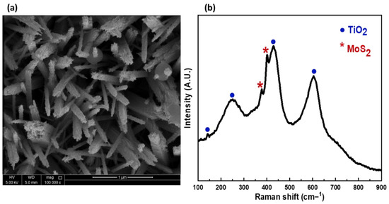 (a) SEM top view image, (b) Raman scattering spectrum of MoS2/TiO2 heterostructure.
