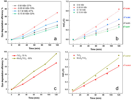 (a,b) dye degradation efficiency and kinetic plots of TiO2 NRs with different KBr concentrations, (c,d) dye degradation efficiency and kinetic plots of MoS2/TiO2 heterostructure and TiO2 NRs with 0.05 M KBr.