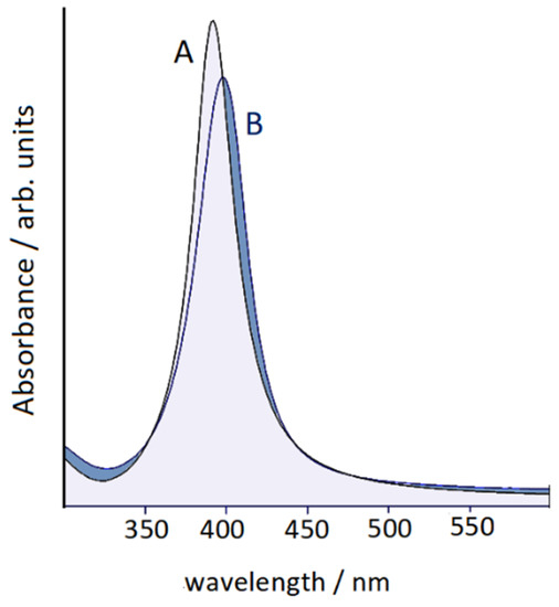 UV–vis absorption spectra of Ag colloids without (A) and with (B) the presence of piperidine.