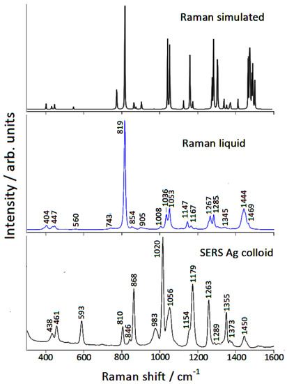 Finally, it must be emphasized that our SERS spectrum in the silver colloid activated with chloride anions was very similar to that recorded on Ag/AgCl electrode with KCl as electrolyte at potential V = 0 [38]. This is not surprising, because even on the electrode the chloride anions performed their SERS activation and the electrode at potential V = 0 was positively charged, as it was greater than the zero-charge potential [39].