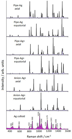 For each of the three complexes, called Pipe-Ag, Pipe-Ag+ and Anion-Ag+, we considered the possibility that piperidine binds to silver both in the axial position and in the equatorial position, due to an interconversion between conformers. Thus, we performed DFT calculations to obtain structures and Raman spectra of silver complexes, as shown in Figure 3. The binding energies of the anion-Ag+ bonds were much larger (i.e., more negatively valued) than those corresponding to the complexes with the neutral molecule, whereas the energy differences between axial and equatorial conformations were almost negligible as reported.