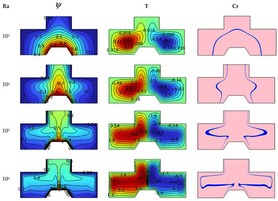 When Ra = 106, the intensity of thermal buoyancy becomes very high, and we notice that the center of the vortex is divided into two parts, the first near the cold wall and the second near the hot fin. For the heat capacity contours (Cr), we notice an effect of the number Ra on the heat capacity (Cr). We notice that there is a line in the form of a semicircle around the trapezoidal fin for Ra = 103, then it is divided into two symmetric parts as the number Ra increases. The blue lines indicate the regions where the change of physical state occurs for PCM nanoparticles. We notice that the lines expand in terms of Ra because the movement of suspension particles increases in terms of Ra. In addition to this, it is noticed that the two heat capacity lines are thinner, close to both cold and hot walls, while they are thicker in the middle of the room. The greater the temperature gradient, the thinner the thickness of the equivalent heat capacity line for the zones where the change of physical state occurs.